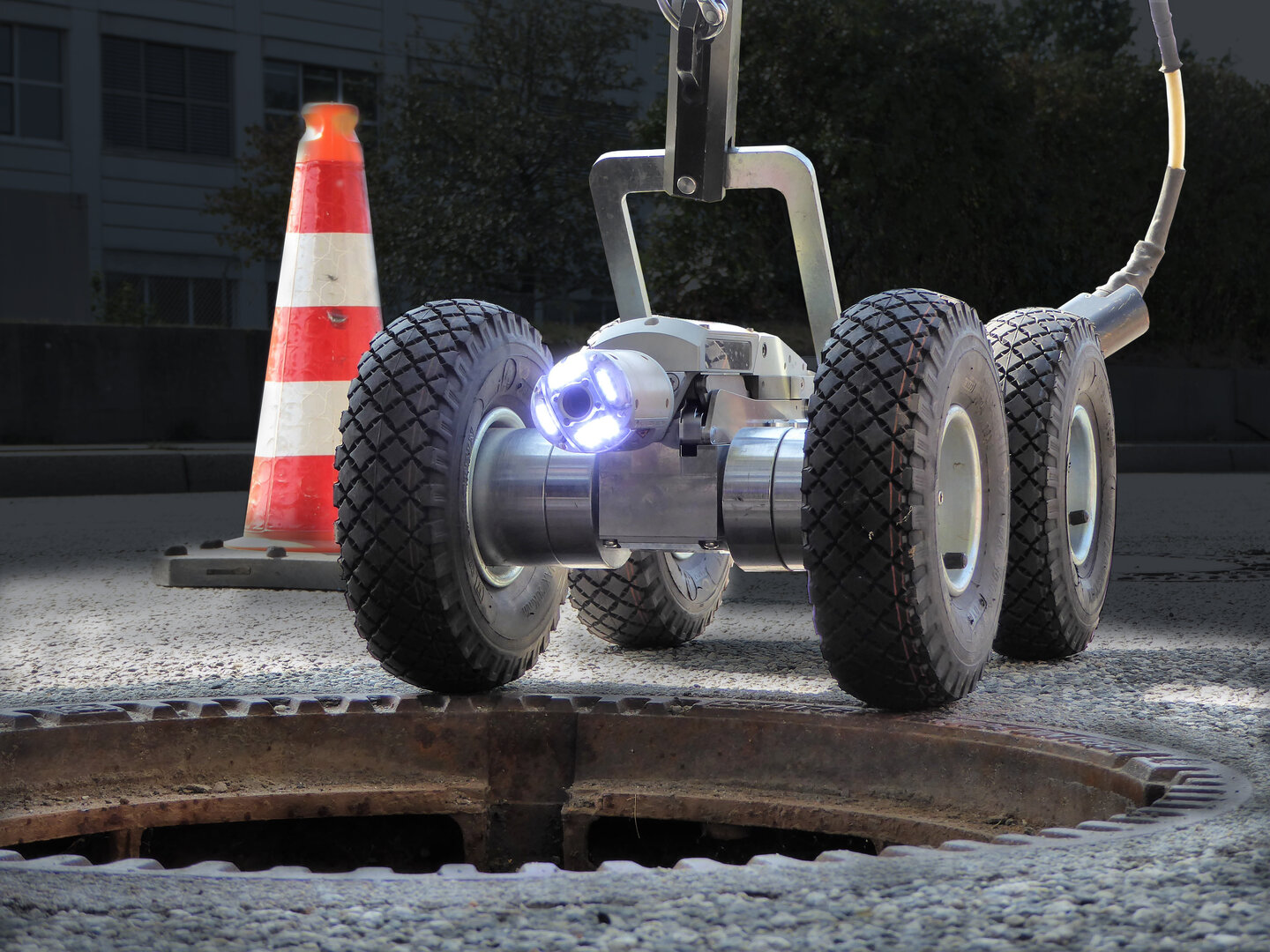 First, the sewer was cleaned in preparation by means of a mobile ultra-high pressure water jet robot. Existing incrustations and adhering substances were removed. The inspection was then carried out using the ARGUS 5 pan, tilt and rotate camera. With this camera, which is designed for use in pipes of DN 200 and larger, the camera image always remains erect and non-reversed, even when the camera head is panned, tilted or rotated, so that the viewer can orientate himself without any problems. For the inspection, the sewage was pumped out and reintroduced into the sanitary sewer at a different point.