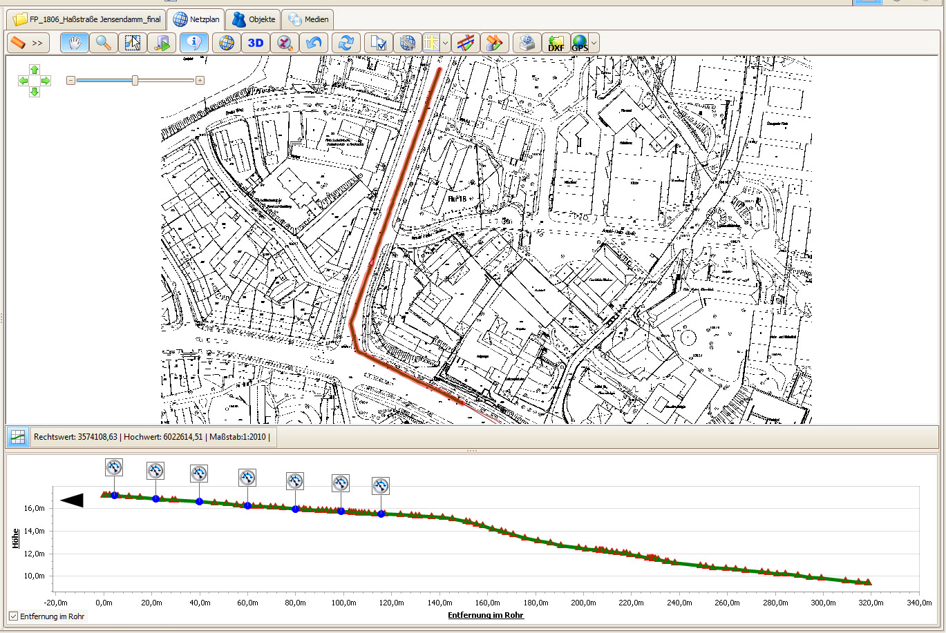 Für die Auswertung der Messergebnisse wurden die insgesamt vier Teilstücke der Untersuchung in einem Objekt zusammengefasst. Die IBAK-Softwareentwicklung hat die Verschneidung dieser Teilstückdaten umgesetzt, um auch mit derart komplexen Echtdaten neue Erkenntnisse über den Einsatz von 3D-GeoSense zu erlangen. "Wir haben hier ein eindrucksvolles Praxisbeispiel, in dem eine sehr hohe Genauigkeit der x- und y-Koordinaten gewährleistet werden kann. Die Genauigkeit der Höhenangaben über den gesamten Rohrverlauf ist nochmals besser, und in diesem Praxiseinsatz erwiesen worden.", konstatiert Lüdeke Graßhoff. Insgesamt wurden an die 800 Messpunkte (Haltungspunkte mit x,y,z-Koordinaten) ermittelt, sodass annähernd für jeden Meter der Haltung ein verifizierter Messwert zur Verfügung steht.