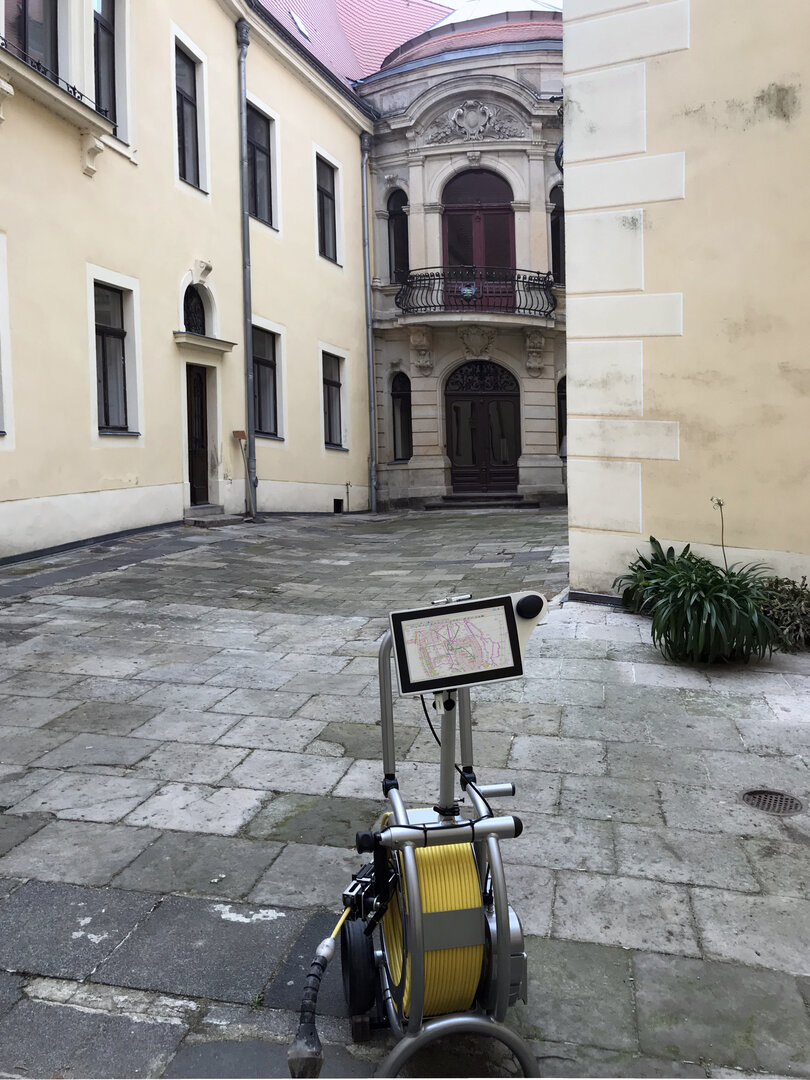 Für das Schloss Hirschstein soll die Erfassung und Inspektion des Kanalnetzes erfolgen. Für ein gesamtheitliches Sanierungskonzept sollte nicht nur die Ursache für die enorme Feuchtigkeit im Schloss gefunden werden, sondern auch der Rohrverlauf mit Breiten-, Längen- und Höhenangaben (xyz-Koordinaten) vermessen werden. Dazu nutzte das Unternehmen ebenfalls die MiniLite, mit der in Verbindung mit dem 3D-GeoSense-Softwaremodul und der mit 3D-Sensor ausgestatteten Dreh- und Schwenkkopfkamera ORION 2.8 L eine 3D-Verlaufsmessung durchgeführt werden kann. Zudem ist für den Auftrag eine transportable kompakte Anlage notwendig, da der gepflasterte Innenhof nur über Türen von umliegenden Räumlichkeiten erreichbar ist.