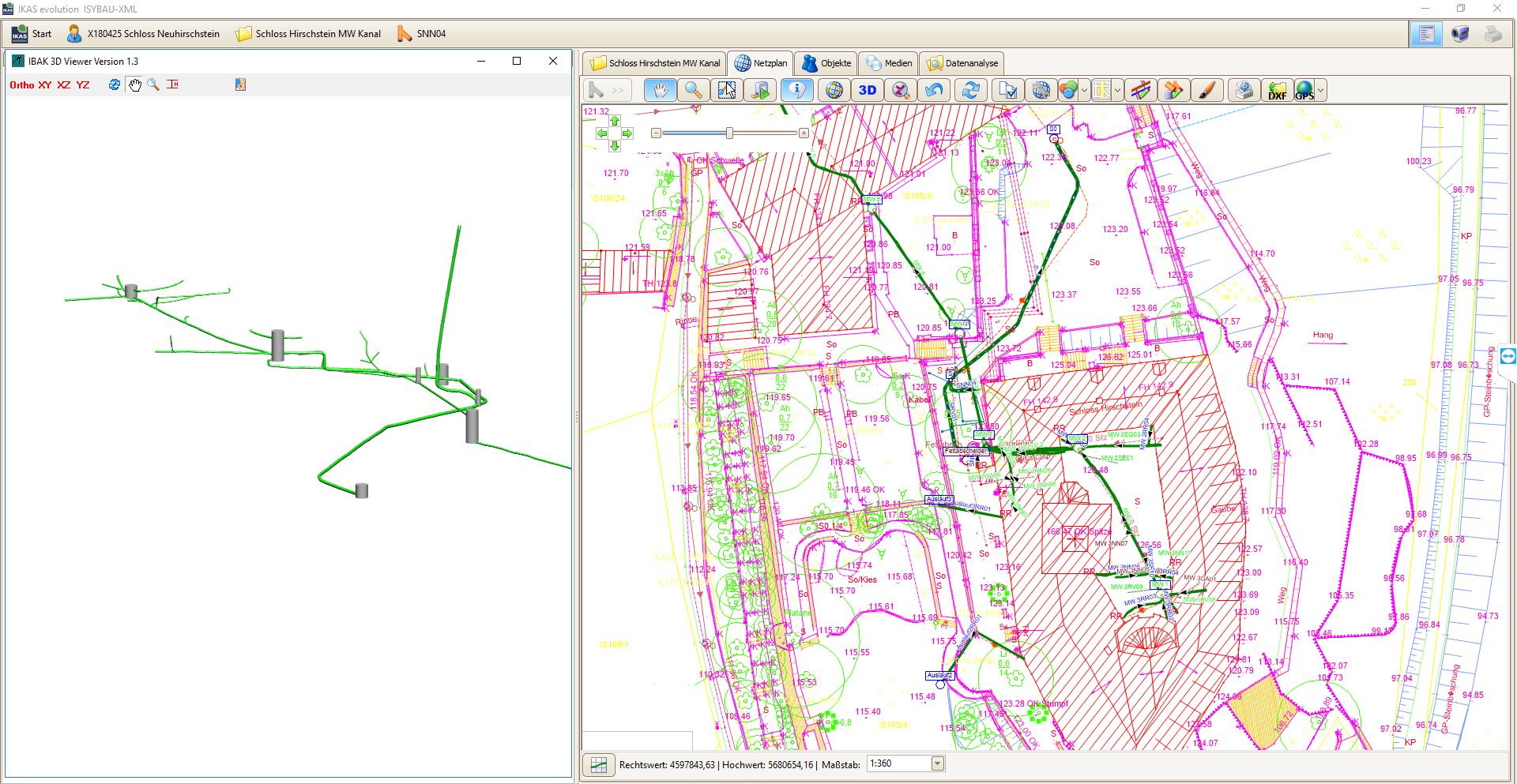 Während der laufenden Inspektion und automatischen Vermessung ist die Kameraposition der ORION 2.8 L jederzeit der sich aufbauenden Netzgrafik auf dem Display der MiniLite zu entnehmen. Die 3D-GeoSense-Rohrverlaufsmessung misst die x,y,z-Koordinaten der Leitungen, sodass bauliche Spezifikationen wie z.B. gezogene Rohrmuffen oder gebogene Rohre realitätsgetreu registriert werden. Glöckler und Briese dokumentieren bei der Inspektion eine Vielzahl von verschobenen Rohrverbindungen und Undichtigkeiten im Rohrverlauf. Im Vorhof rechts vor dem Schloss stellen die erfahrenden Inspekteure an den Rohrverbindungen der Steinzeugrohre Wurzeleinwüchse und einen Rohreinbruch fest, der zu Unterspülungen und damit zum Absacken des Erdreichs führen kann. Über die unterirdischen Ursachen für die Feuchtigkeit im Fundament hinaus, weisen die umsichtigen Mitarbeiter der Komplex Umweltservice GmbH auf undichte Regenrinnen hin. Die umfassenden Daten aus der geodätisch exakten Lagevermessung der abwassertechnischen Anlagen übergeben sie dem von der Gemeinde beauftragten Ingenieurbüro. Sie dienen als Grundlage für die Kalkulation notwendiger Investitionen und die Planung der baulichen Umsetzung unter optimalen Mitteleinsatz.