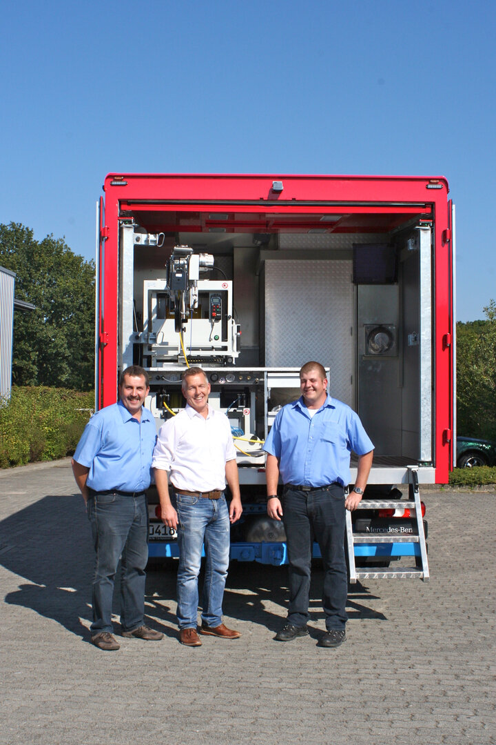 Neben den technischen IBAK-Systemkomponenten zur Kanalrohrinspektion und Dichtheitsprüfung wurde der Wagen mit einer Hebevorrichtung für die Inspektion hinter Schutzplanken an Autobahnen ausgestattet. Die Sonderanfertigung setzte IBAK in Kooperation mit einem Karosserie- und Fahrzeugbauer um. Mit einer Auslegerlänge von 2 m und einer Tragkraft von bis zu 150 kg ist der Lastarm eine praxisorientierte Konstruktion, um Kamera und Fahrwagen über die vorwiegend 75 cm hohen Leitschienen zu heben. Die Hebevorrichtung aus Stahl-Rechteckprofilen kann sowohl links- als auch rechtsseitig im Aufbauheck befestigt werden. Über eine Laufschiene kann der Abstand des Seilzugs vom Fahrzeug mit einem 15 m langen und 5 mm starken Drahtseil flexibel eingestellt werden.
