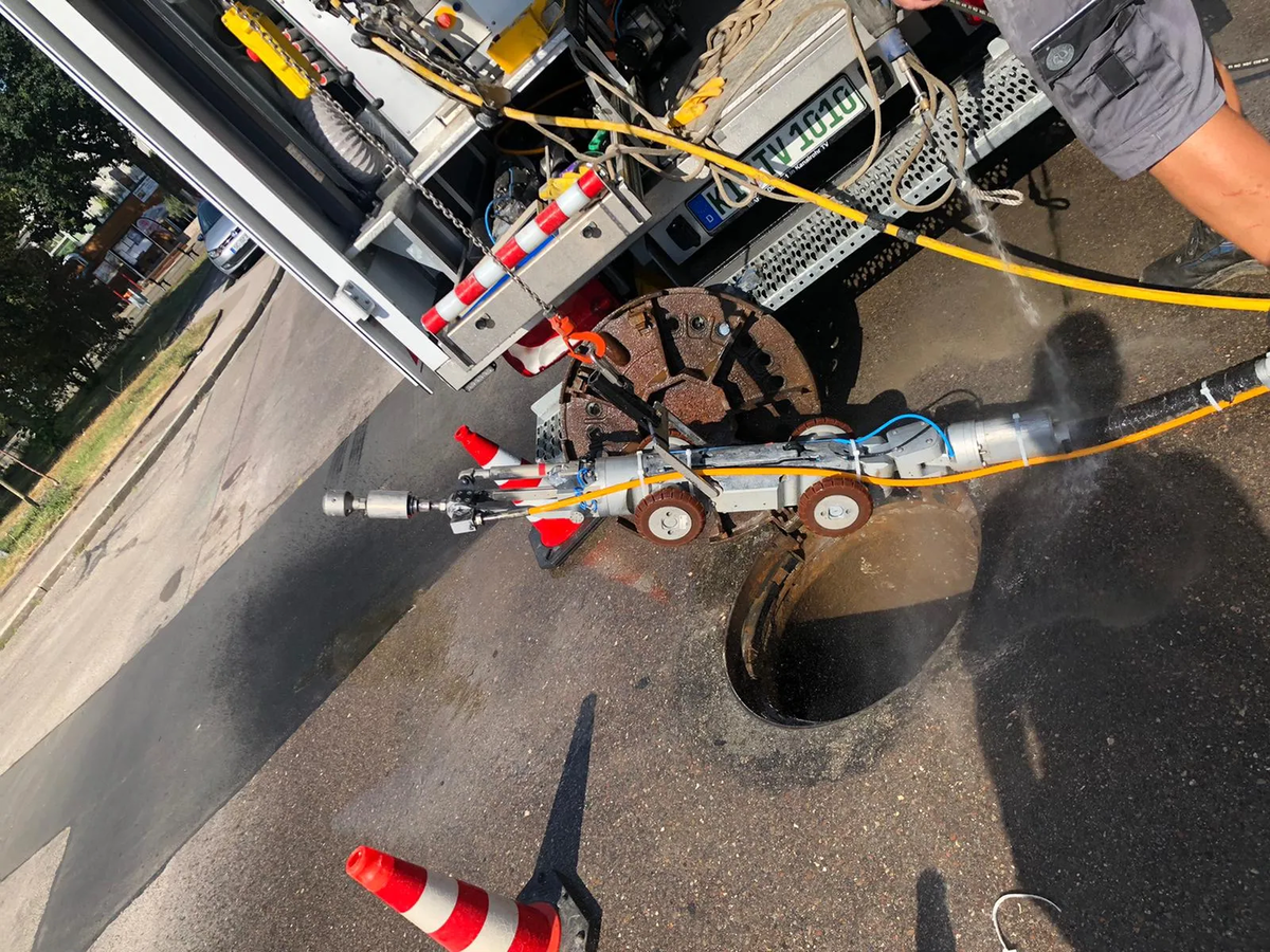 Die Befahrung erfolgte gegen die Fließrichtung mit kontinuierlicher Geschwindigkeit des MicroGator-Geräteträgers, an dem unter anderen die magnetgebremste falch-Höchstdruck-Wasserstrahldüse Drainspeed 30 und der X-Jet Kreuzstrahlkopf adaptiert wurden. Die Rotation der falch-Düsen erzielte mit 2500 bar und 24 l/min eine sehr gute abscherende Wirkung. Dabei wurde der Anstellwinkel der jeweiligen Düse so eingestellt, dass nur der zu entfernende Beton und nicht die Rohrwand bearbeitet wurde. Begonnen wurde in der 51 Meter langen Haltung. Nach der Einfahrt des Roboters konnte die Betonwand nach 43 Metern gefunden werden. Der feste Beton wurde über eine Strecke von 8 Metern bis zum Schacht unter Kamerabeobachtung Stück für Stück zerkleinert und anschließend aus der Haltung gespült. Im Schacht selbst wurde der Beton manuell entfernt. In der anschließend bearbeiteten zweiten Haltung konnte bei 2,50 Meter der Verursacheranschluss eingesehen werden. In dieser Haltung konnte der Beton über einen Abschnitt von weiteren 11 Metern auf diese Weise vollständig entfernt werden.