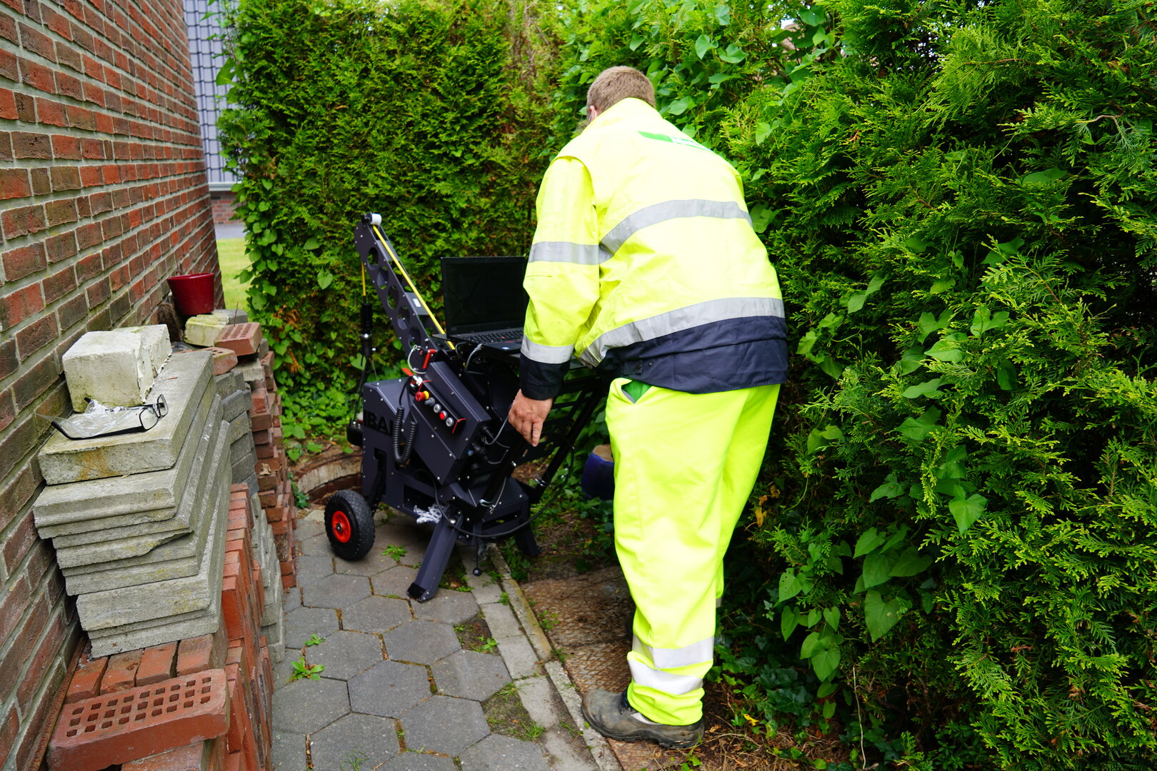 Ausgewählte Schächte befanden sich auf schmalen Grundstücken innerhalb eines Ferienhausgebiets. Jeweils hinter dem Haus in einem engen Bereich zwischen Hauswand und bepflanzter Grundstücksgrenze gelegen, waren die Schächte für ein Inspektionsfahrzeug unzugänglich. Eine von zahlreichen Situationen, in denen das Fahrzeug nicht direkt am Schacht positioniert werden konnte.