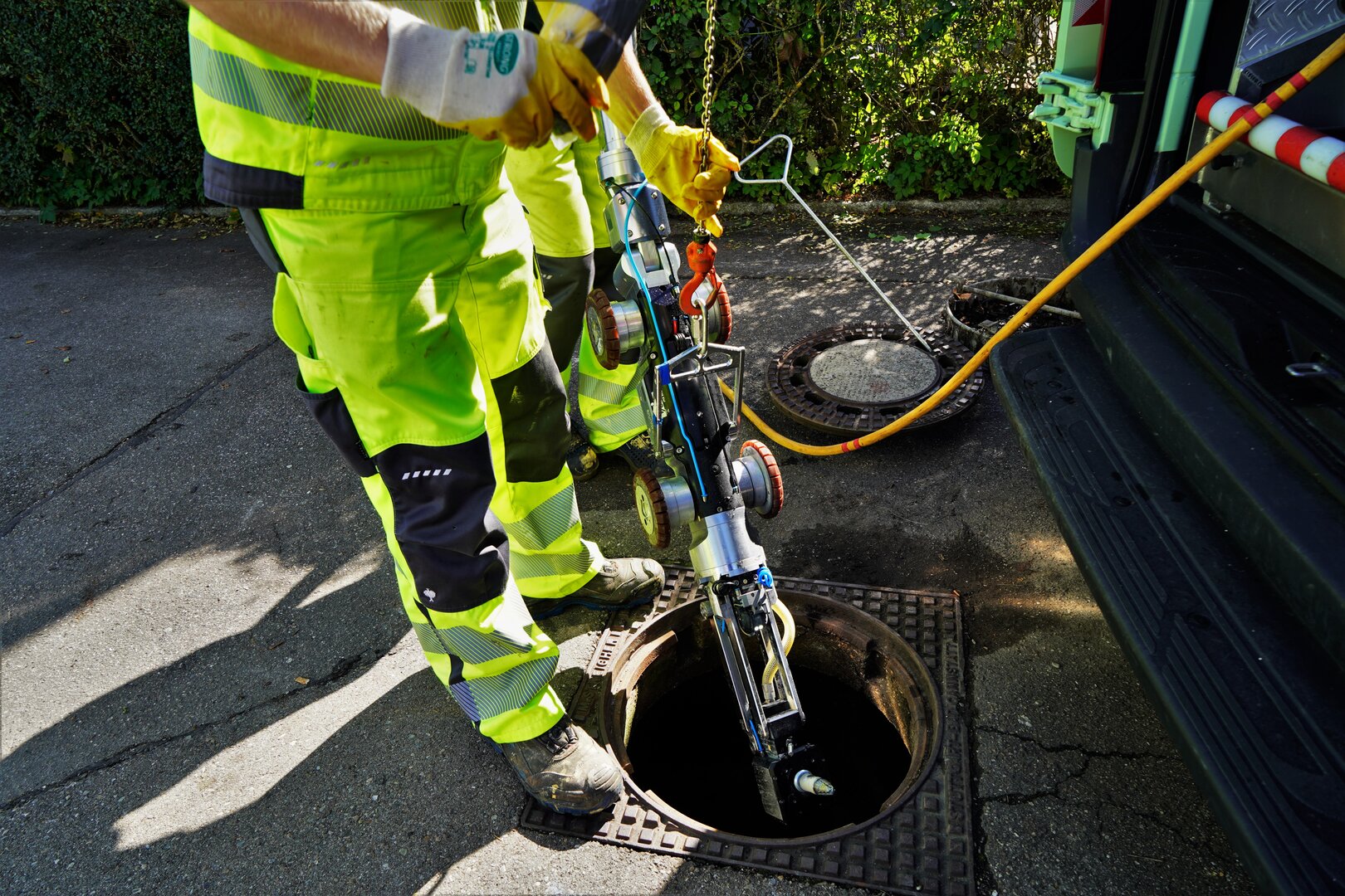 Bevor eines der „UV-Teams“ mit dem Einbau der Schlauchliner beginnt, nehmen die „Fräser-Teams“ vorbereitende Fräsarbeiten in den Haltungen vor. Dazu gehören beispielsweise Wurzeln beseitigen, einragende Stutzen und anhaftende Ablagerungen entfernen sowie Muffenversätze glätten. Das Fräsen verursacht Absplitterungen und verwirbelt weiteren Schmutz. Für eine Kamera ist das kein optimales Umfeld. „Die CutterCam hat kein Problem damit: Ein permanenter Luftstrom hält die Kameralinse frei von Frässtaub. Größere Teilchen kann ich auch per Knopfdruck mit Wasser in Sekunden wegspülen“, berichtet Bügler. Bei extremen Verschmutzungen bestehe zudem die Möglichkeit, durch ein Verschwenken der Kamera über eine Gummilippe, diesen restlos zu beseitigen.