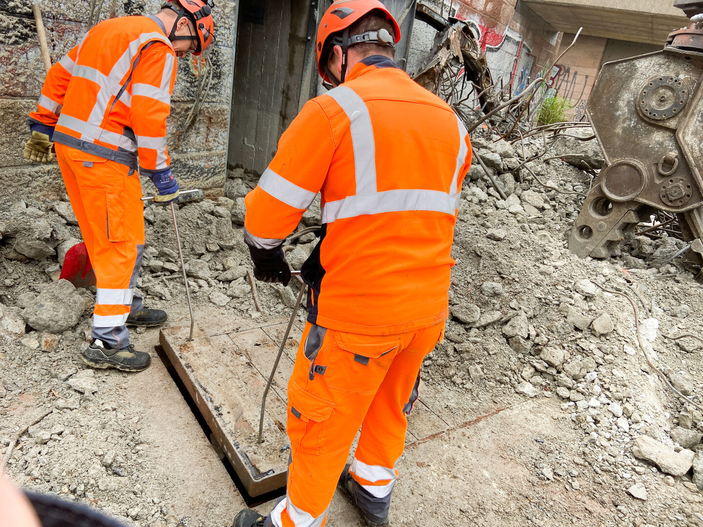 Eine temporäre Lösung bot sich durch eine spezielle Gummiblase an, die für Kanäle mit einem Meter Durchmesser geeignet ist. Teamleiter Würfel koordinierte die Arbeiten mit seinen Kanalspezialisten Alexander Würzburg und René Mehlhorn, wobei sie unerwartet vom Schweißer Dirk Wyscik unterstützt wurden, der zufällig vor Ort war und sich nach Beschaffung seiner Ausrüstung sofort den Arbeiten anschloss.