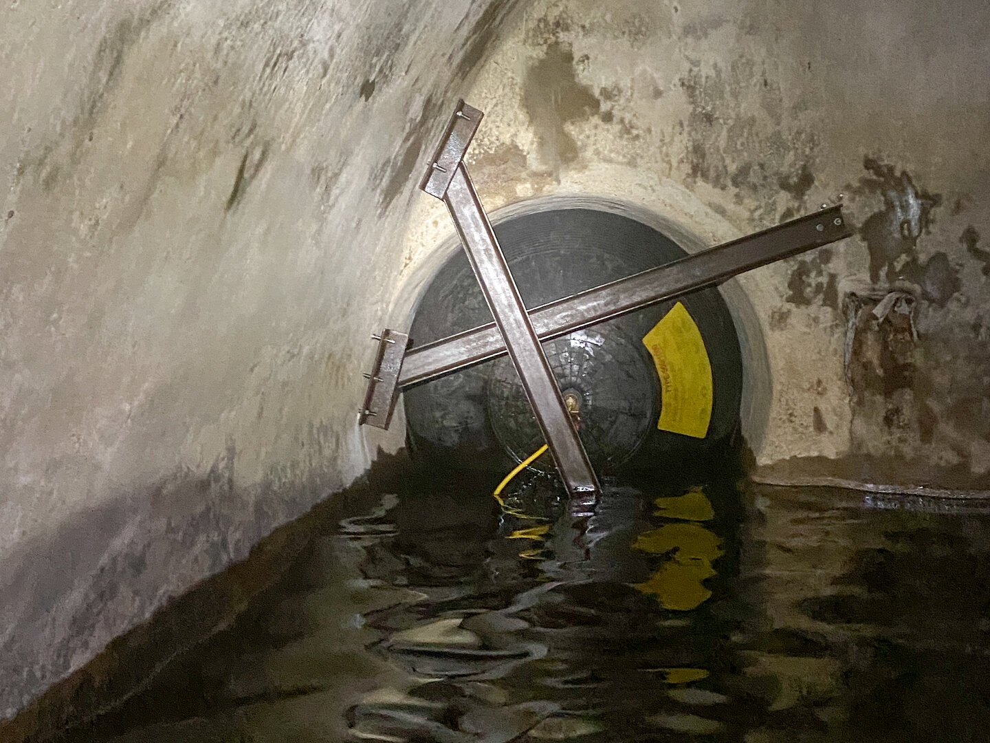 Unter widrigen Wetterbedingungen wurde die Gummiblase in den bereits stark wasserführenden Hauptkanal eingebracht und im Regenüberlaufbauwerk mit Druckluft gefüllt. Die Sicherung erfolgte durch zwei eigens gefertigte Stahlträger. Die Abdichtung konnte gegen 16 Uhr abgeschlossen werden - gerade noch rechtzeitig, da der Wasserstand bereits die oberen Ränder der Wathosen erreichte.